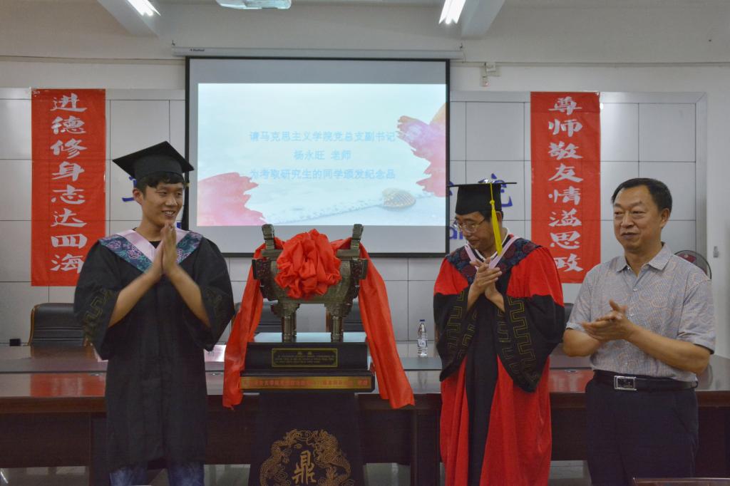 毕业典礼在雄壮的国歌声中拉开序幕,教授委员会委员、教师代表、毕业生代表、在校生代表分别进行了发言。发言结束后行拨穗礼,公司雎密太教授为毕业生拨冠正穗。同时,公司副书记为考取研究生的同学颁发纪念品,希望他们不忘初心,继续前进。接下来的宣誓环节由毕业生代表胡彦琪同学作为领誓人,带领全体毕业生庄严宣誓。最后毕业生向公司赠送礼物,大家合影留念,毕业典礼圆满落下帷幕。