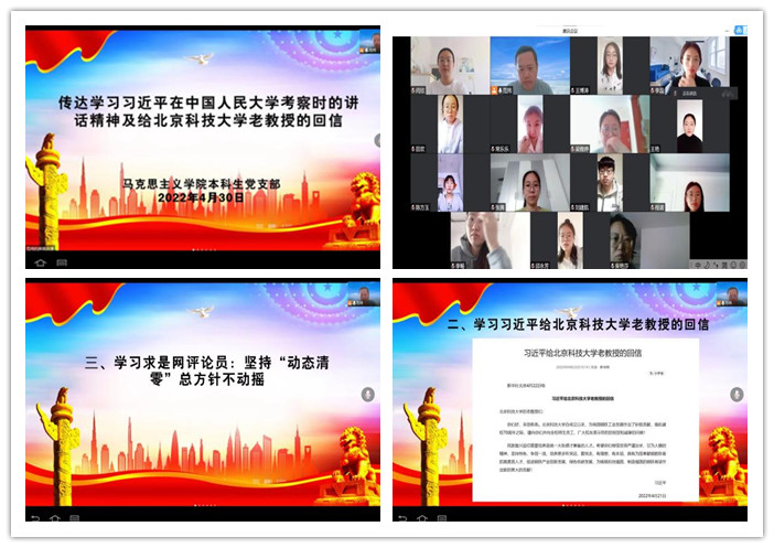 430党支部书记范炜主持学习习近平总书记在中国人民大学考察调研重要讲话精神习近平总书记给北京科技大学老教授的回信求是网评论员:坚持动态清零总方针不动摇》。