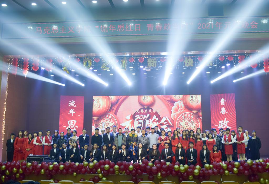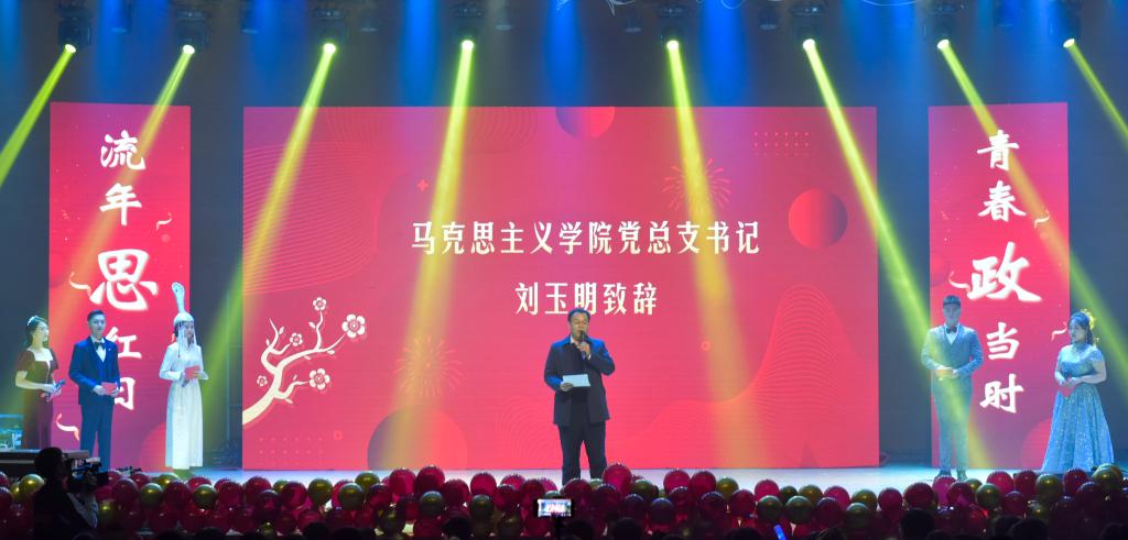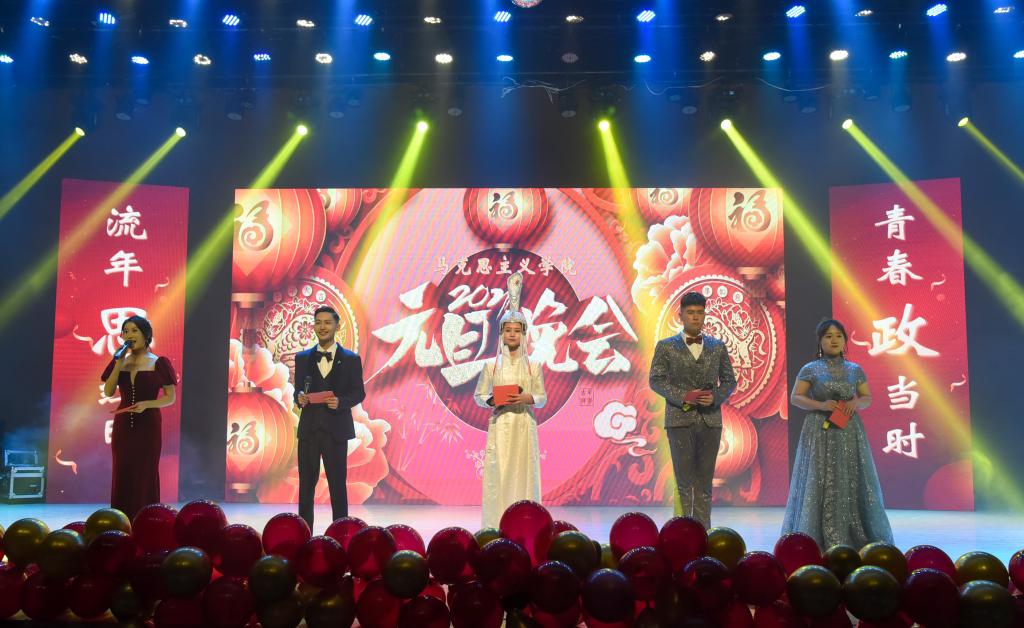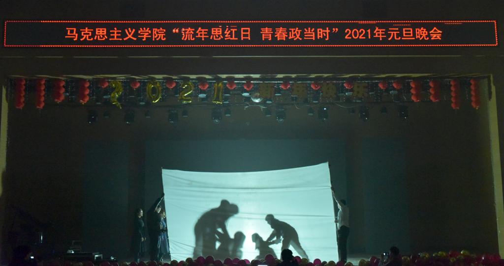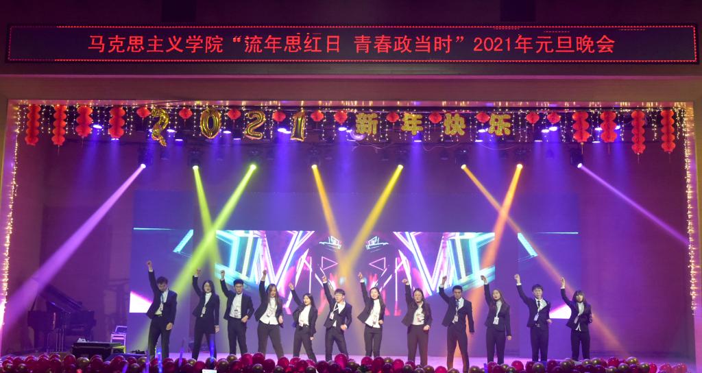 首先,公司党总支书记刘玉明致新年贺词。刘玉明在致辞中指出,在2020这个不平凡的一年,suncitygroup太阳新城在党建工作、教学科研、学风建设、员工活动等方面,取得了优异的成绩,收获了丰硕的成果,并向为公司发展付出辛勤努力的老师和同学们表示衷心的感谢。刘玉明强调,举行盛大的“流年思红日 青春政当时”元旦晚会,就是为了更好地学习宣传贯彻习近平新时代中国特色社会主义思想,更好地传播马列主义,更好地坚定文化自信,为马院师生点赞,并向全体师生送上美好的新年祝福。紧接着,晚会在嗨翻全场的开场舞中拉开帷幕。本次元旦晚会共分为“流年思红日”、“青春政当时”两个篇章。