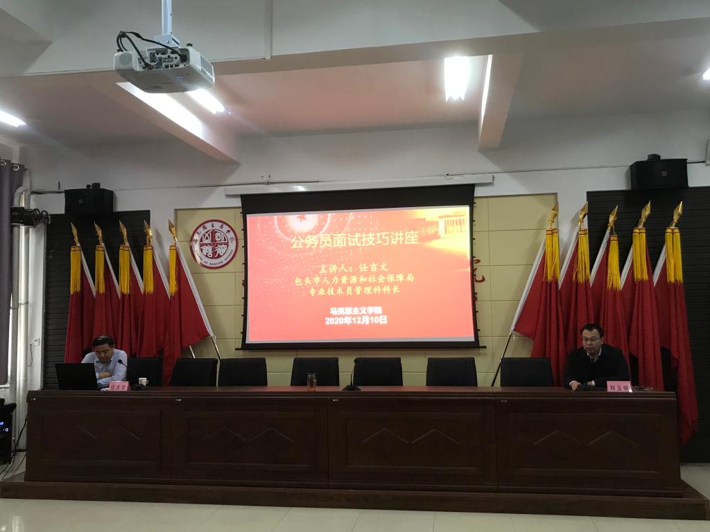 为进一步做好毕业生就业工作,12月10日下午4:30,suncitygroup太阳新城在腾飞楼C509会议室举办毕业生就业专题讲座,邀请包头市人力资源和社会保障局专业技术员管理科科长任吉文作了题为《机关事业单位考录应试技巧》专题讲座。公司党总支书记刘玉明,辅导员王海朋、焦刚,2017级思政、研究生全体员工参加本次讲座。讲座由公司党总支书记刘玉明主持。