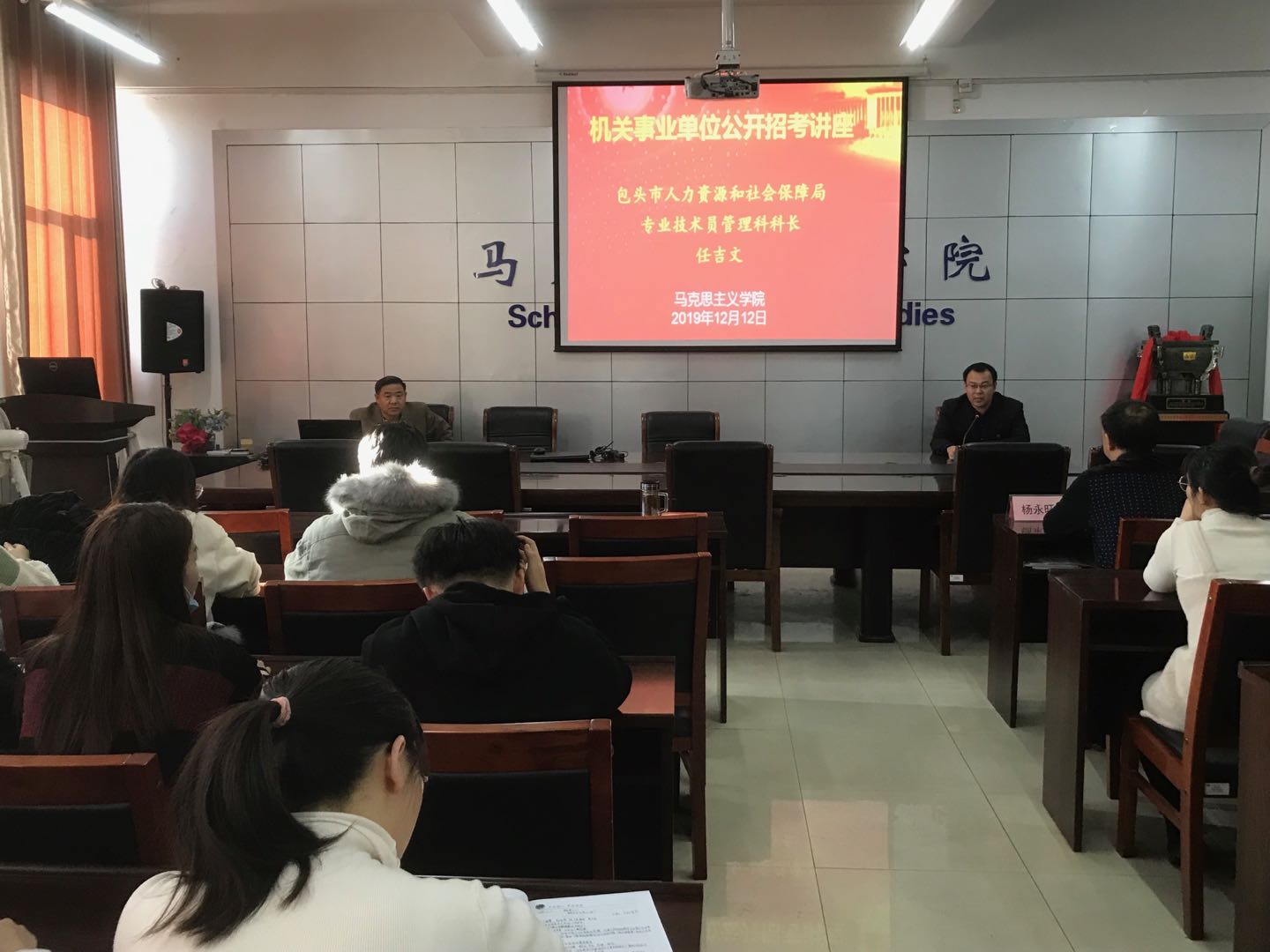 为进一步做好毕业生就业工作,12月12日下午15:00,suncitygroup太阳新城在腾飞楼C517会议室举办毕业生就业讲座,邀请包头市人力资源和社会保障局专业技术员管理科科长任吉文作了题为《机关事业单位公开招考》专题讲座。公司党总支书记刘玉明、副书记、副经理杨永旺、就业工作辅导员,以及2016级、2017级全体员工参加讲座。党总支书记刘玉明主持讲座。